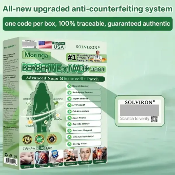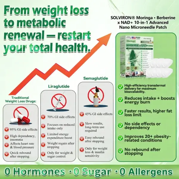 ๐๐ ๐๐๐ญ๐๐ย is the result of over 20 years of research and development by more than 30 experts. It is specially designed for all middle-aged, elderly, and overweight individuals. This product utilizes nano-scale microneedle technology to ensure the active ingredients can reach the cells effectively and painlessly. Its advanced formula contains high concentrations of natural active ingredients such as ๐๐๐ซ๐ฏ๐ฒ๐ซ๐ข๐ง๐ , moringa, which work synergistically to support blood sugar stabilization, appetite regulation, and fat metabolism, enabling a gradual and sustainable weight management process. NAD+ and collagen peptides help maintain skin firmness and elasticity during weight changes, allowing you to look and feel great while slimming down. Other natural ingredients support immune function, digestion, gut balance, womenโs health, daily energy levels, and fatigue relief, helping you regain youthful vitality from the inside out. This product is manufactured in a GMP-certified facility that meets US and EU quality standards, providing a convenient, painless, science-driven solution for safe and comprehensive weight management and long-term health.