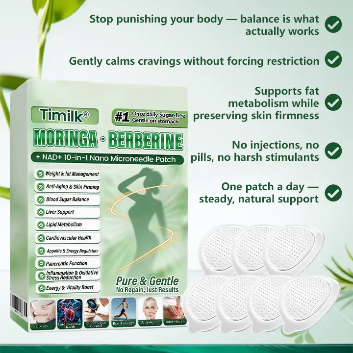 Healthy fat loss occurs when the body feels safe, balanced, and regulated โ not stressed or deprived.By delivering active compounds steadily through the skin,Timilkยฎ Moringa ยท Berberine + NAD+ 10-in-1 Nano Microneedle Patch avoids spikes, crashes, and rebound hunger.