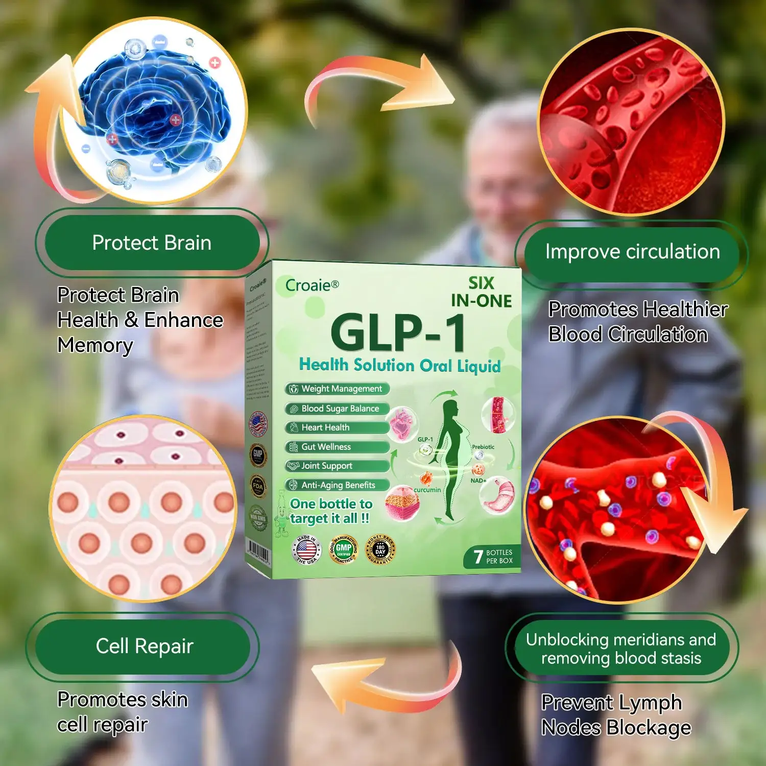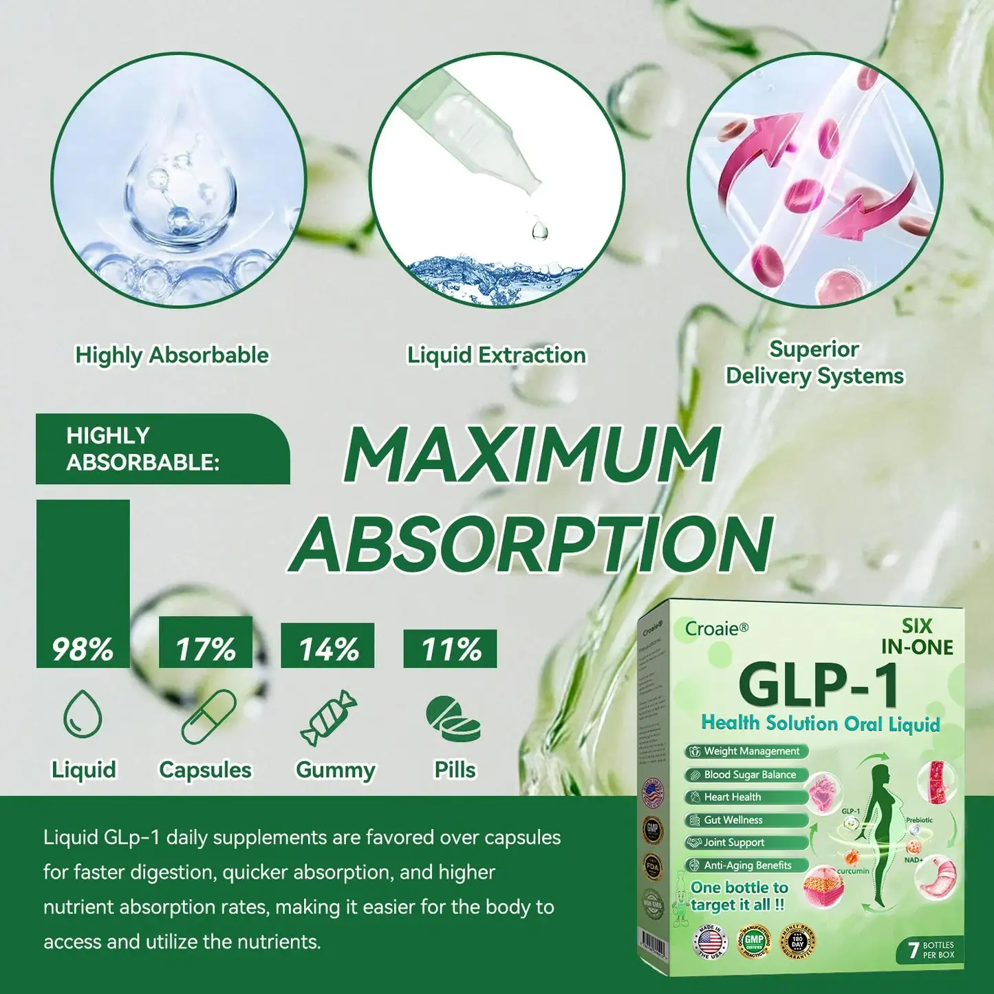 🍀 Croaie® oral solution, based on the breakthrough research of Tirzepatide (GLP-1 and GIP), helps control appetite, improve metabolic efficiency, enhance cardiovascular function, and balance digestion. Clinical studies have shown that dual activation of GLP-1 and GIP can increase weight loss success rates by up to 2.5 times compared to diet alone.