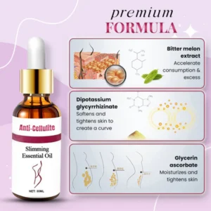 Anti-Cellulite- Get rid of lumpy textured skin with the Anti-Cellulite Slimming Essential Oil. The Anti-Cellulite Slimming Essential Oil effectively eliminates cellulite on almost any part of your body.