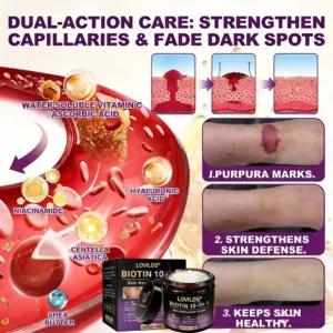 Age spots and senile purpura are often caused by sun exposure and fragile capillaries. LOVILDS® Biotin 10-in-1 Skin Restoration Cream combines alpha-arbutin, water-soluble vitamin C, and hyaluronic acid to brighten the complexion, visibly improving uneven pigmentation within 7 days. Centella asiatica strengthens capillaries, helping purpura fade by up to 68% in 14 days. Biotin and collagen peptides accelerate the natural shedding of pigmented cells, boosting skin renewal efficiency by 35%.