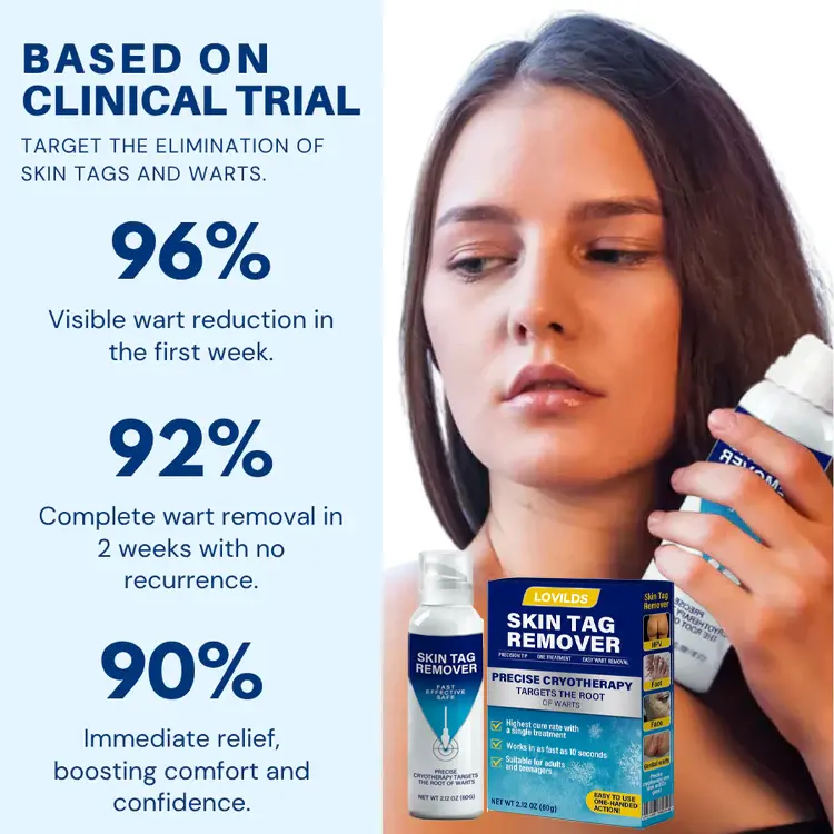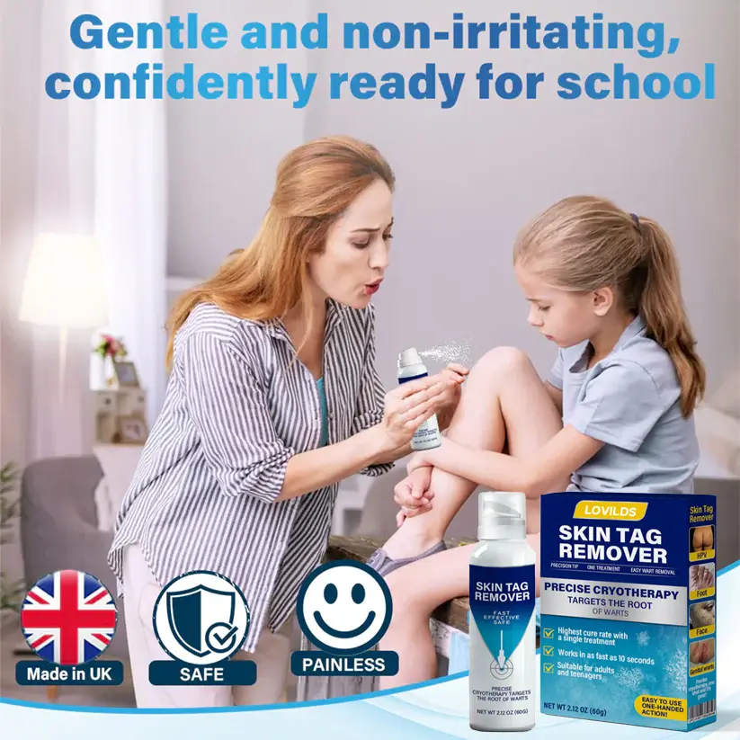 This product is certified and recommended by the British Association of Dermatologists , meeting their high standards for effectively relieving skin symptoms and promoting skin health. Recognized by dermatologists, clinical studies show that it can improve warts and skin lesions within one week, and that wart tissue and damaged skin are basically healed within two weeks. Choose our LOVILDS® Cryo Treatment Spray Effortlessly remove skin tags and warts-no pain, a non-invasive solution for wart removal and skin repair, allowing you to enjoy a comfortable, reliable, and trustworthy experience.