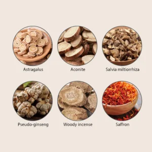 - Ingredients: Astragalus, Aconite, Salvia miltiorrhiza, Pseudo-ginseng, Woody incense, Saffron