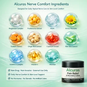 Designed to support daily nerve comfort and overall physical ease, ALCURAS® helps address common challenges associated with prolonged nerve irritation—such as burning, tingling, numbness, stiffness, poor sleep quality, reduced mobility, and daily fatigue. By supporting calmer nerve responses and a healthier local tissue environment, it contributes to improved comfort, steadier movement, and better quality of life over time.