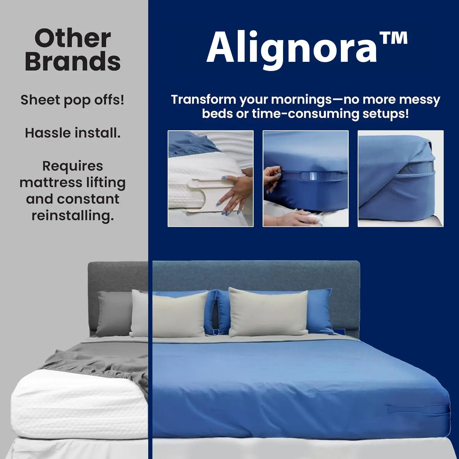 It’s not your mattress. It’s not the sheet quality. Most sheet holders rely on straps that stretch across the mattress and loosen over time. And once one corner slips… everything shifts. Alignora™ fixes the problem at the source.