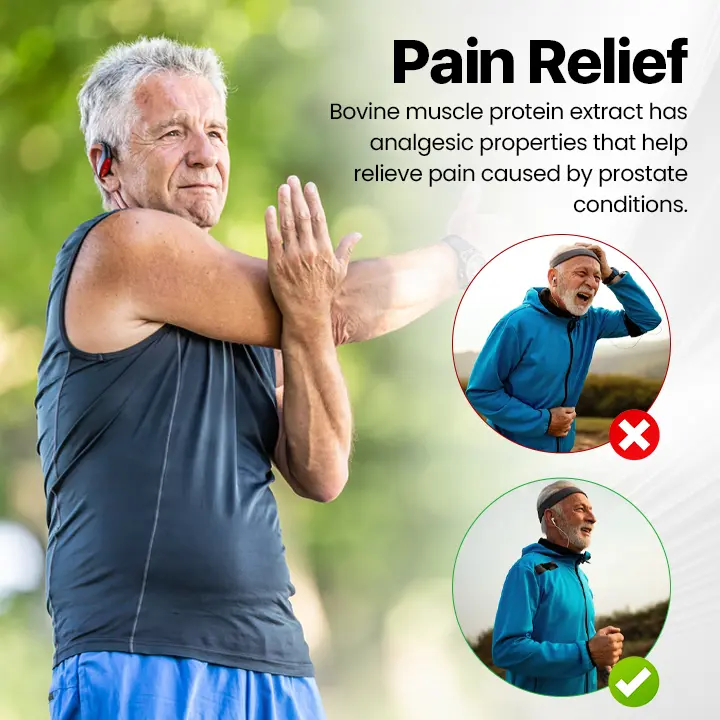 Bovine muscle protein extract has analgesic properties that help relieve pain caused by prostate conditions. The bioactive compounds may interact with pain pathways in the nervous system, reducing discomfort and enhancing overall well-being and comfort.
