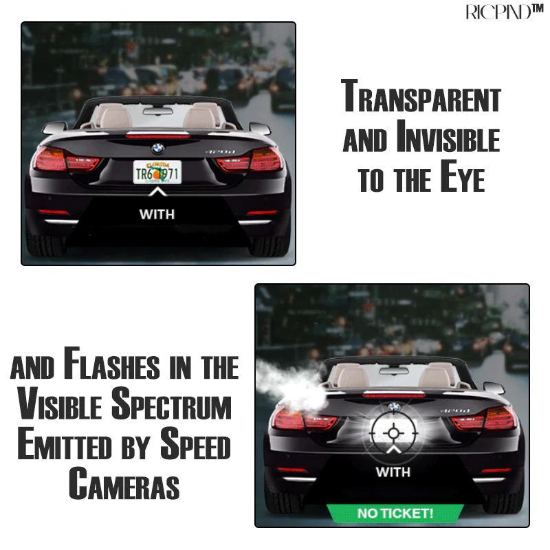 RICPIND Stealth Car Plate Secure Defender Spray is a special coating for your license plates. When sprayed, it creates a protective layer that aims to bounce off flash from traffic cameras. This bouncing effect makes it tricky for cameras, especially those with flash, to capture and read the license plates, lowering the chance of getting caught by speed or red-light cameras and avoiding fines.