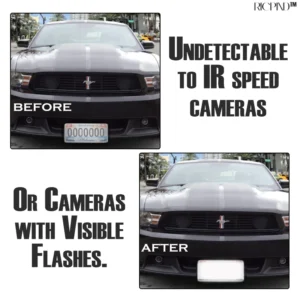 It prevents speed cameras and radar devices from detecting infrared signals and flashes within the visible spectrum. This feature helps maintain privacy and reduces the likelihood of being identified by such surveillance equipment. RICPIND Stealth Car Plate Secure Defender Spray effectively blocks these signals, ensuring added security on the road.