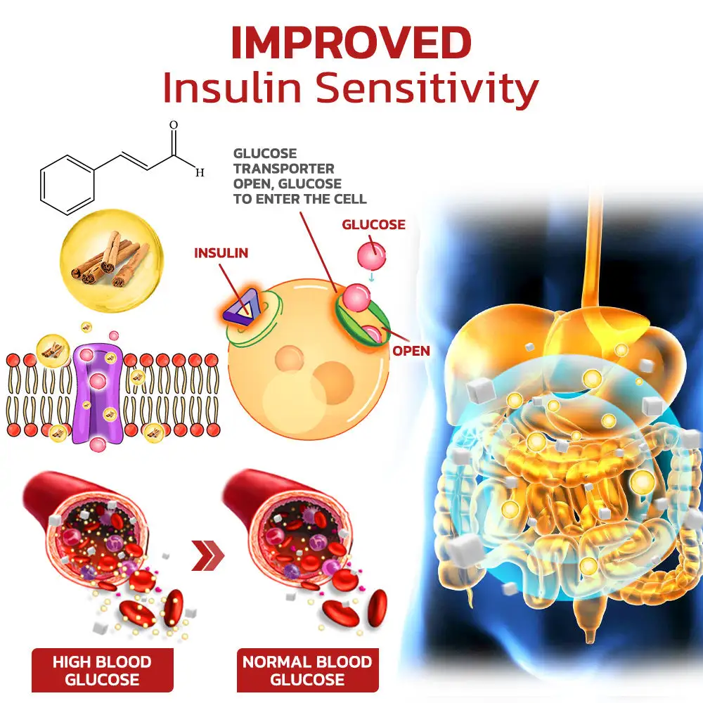 Help Improve Insulin Sensitivity: Cinnamon is known for its ability to lower blood glucose levels by increasing insulin sensitivity and promoting glucose metabolism. Active components in cinnamon, such as cinnamaldehyde, enhance insulin action by increasing glucose transporter proteins in cell membranes. This aids in cellular glucose uptake, leading to lower blood sugar levels and reducing the need for insulin secretion.