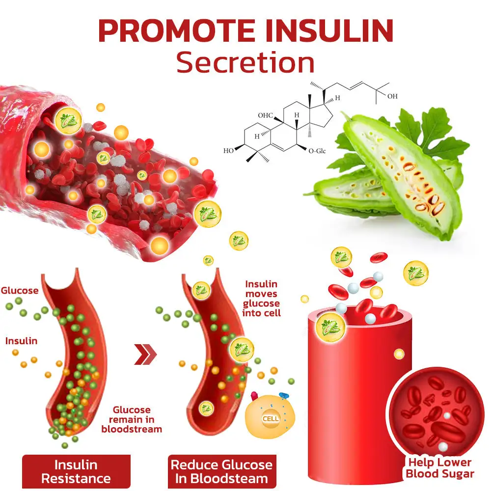 Stimulating Secretion of Insulin: Bitter Melon contains a compound known as bitter melon saponin, which is believed to have insulin-like effects that can directly lower blood sugar. Additionally, bitter melon saponins may help regulate blood glucose by stimulating insulin secretion from pancreatic beta cells, improving insulin sensitivity, and enhancing glucose uptake by cells, thereby lowering blood sugar levels.