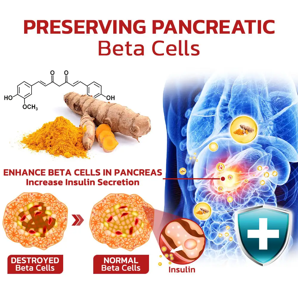 Protective in the Function of Beta Cells, Maintenance of Adequate Insulin Secretion: Curcumin is widely recognized for its potential to protect pancreatic beta cells, which are essential for insulin production. It plays a critical role in preserving these cells’ function, ensuring adequate insulin secretion and better blood sugar control.