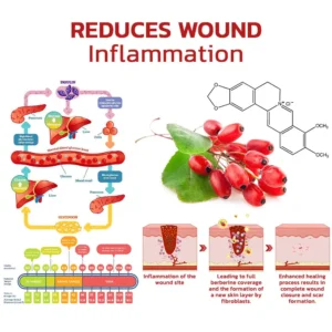 Berberine: This ingredient is known for its anti-inflammatory properties, which inhibit the production of inflammatory factors and reduce inflammation at wound sites. Berberine promotes wound healing by stimulating fibroblast and keratinocyte proliferation, accelerating the growth and renewal of new cells. It also helps control blood sugar by reducing glucose release and inhibiting bacterial growth in wounds.