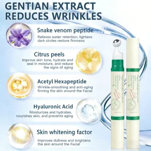 Gentian Extract smooths wrinkles. Snake Venom Peptide reduces puffiness, fades dark circles, and firms. Citrus Peels brighten tone and lock in moisture. Acetyl Hexapeptide targets fine lines for a firmer look. Hyaluronic Acid deeply hydrates to prevent aging. Skin Whitening Factor evens and illuminates.