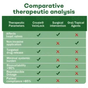 Croaie® VeinLock is the first commercially available transdermal phytotherapy system specifically designed to locally treat venous valve insufficiency through targeted botanical intervention. Unlike systemic therapies that dilute active ingredients throughout the circulatory system or topical applications that cannot penetrate the skin barrier, our microneedle delivery system ensures that concentrated therapeutic agents reach the target tissue directly—with minimal systemic burden.