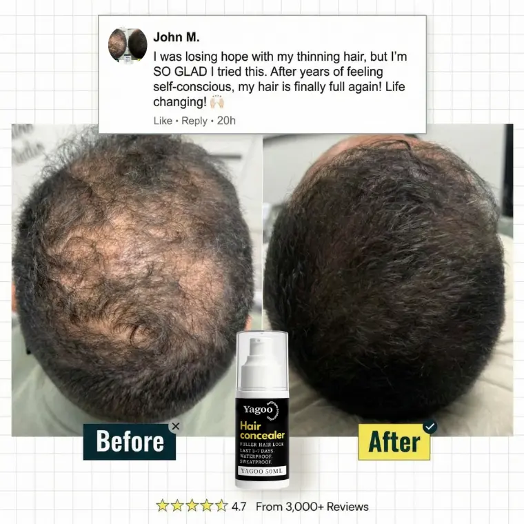 Drag the slider to see how Yagoo visually covers thinning areas with a waterproof hair concealer,creating a natural, sweat-resistant fuller hair look I after about 30 minutes.